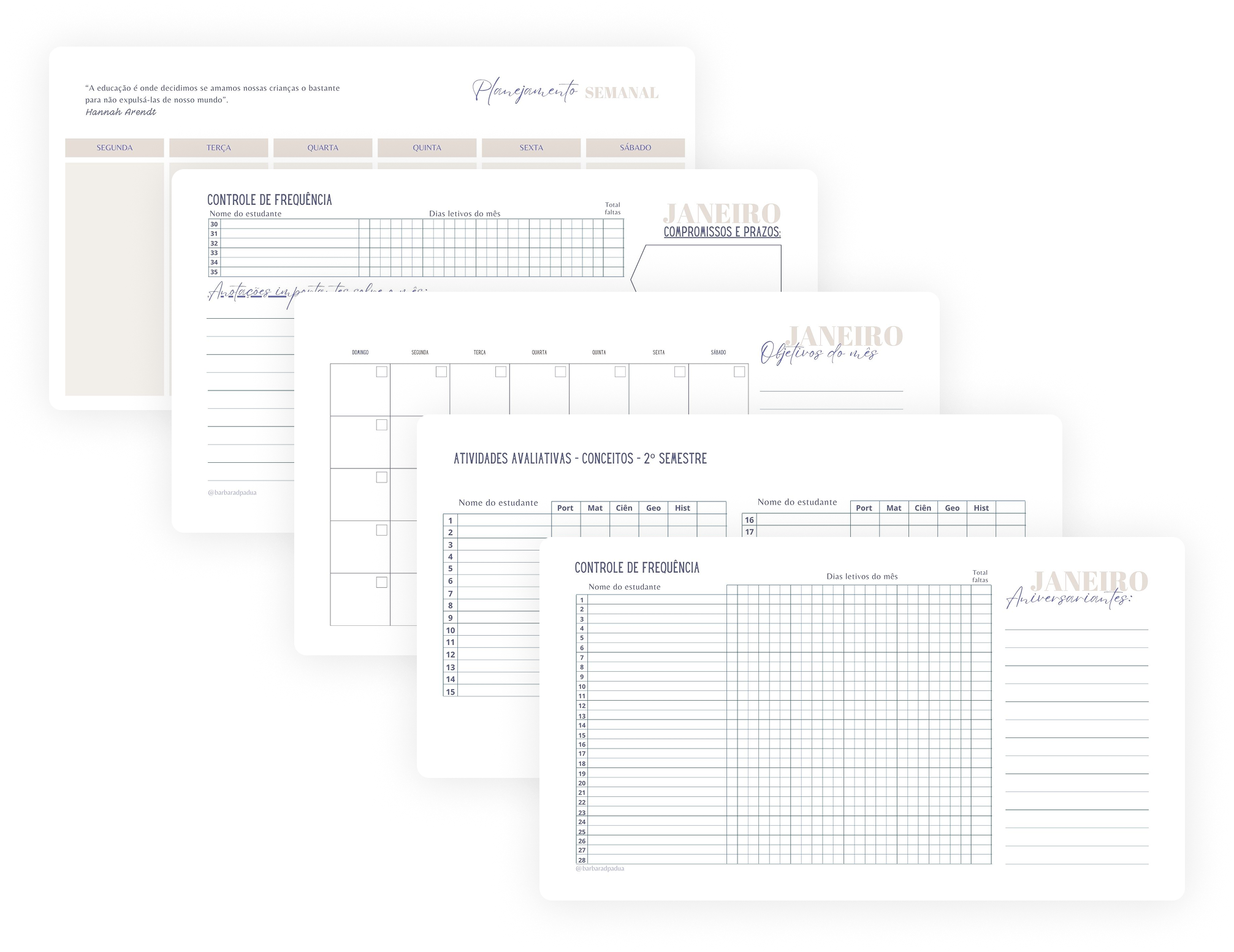Planner completo feito para a rotina real da sala de aula. Reúne tudo que você precisa em um lugar só, planejamento anual, mensal, semanal e diário, controle de turmas, avaliações e muito mais. Você tira o peso da cabeça, enxerga o que é prioridade e sente que tá no controle de novo.